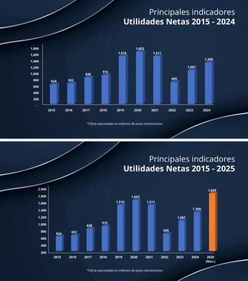 utilidades en un 133%, pasando de RD$789 millones al mes de noviembre 2024 a RD$1,839 millones al mes de noviembre de 2025.